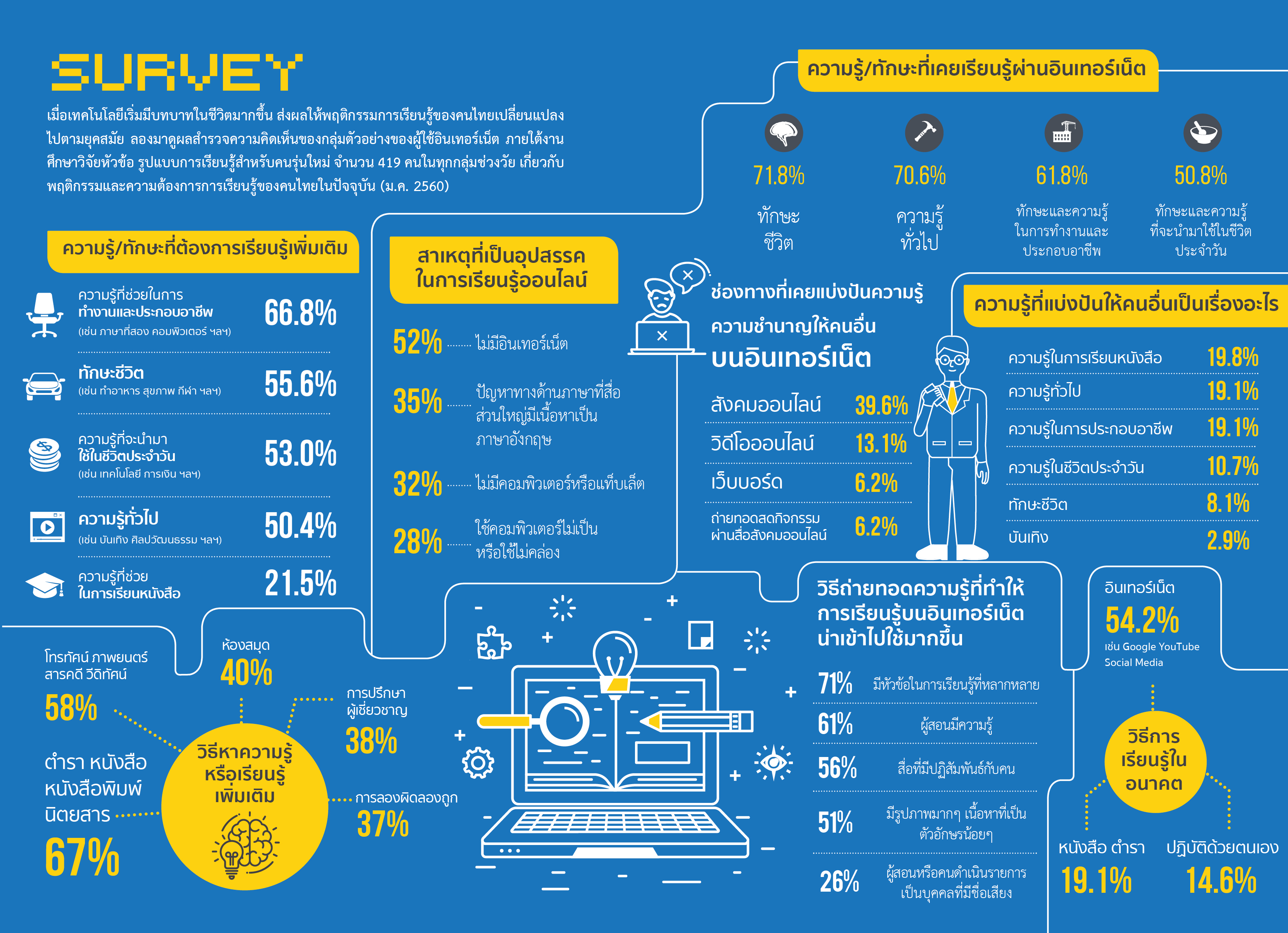 เมื่อเทคโนโลยีเริ่มมีบทบาทในชีวิตมากขึ้น ส่งผลให้พฤติกรรมการเรียนรู้ของคนไทยได้เปลี่ยนแปลงไปตามยุคสมัย ลองมาดูผลสำรวจความคิดเห็นของกลุ่มตัวอย่างของผู้ใช้อินเทอร์เน็ต ภายใต้งานศึกษาวิจัยหัวข้อ รูปแบบการเรียนรู้สำหรับคนรุ่นใหม่ จำนวน 419 คนในทุกกลุ่มช่วงวัย เกี่ยวกับพฤติกรรมและความต้องการการเรียนรู้ของคนไทยในปัจจุบัน (ม.ค. 2560)