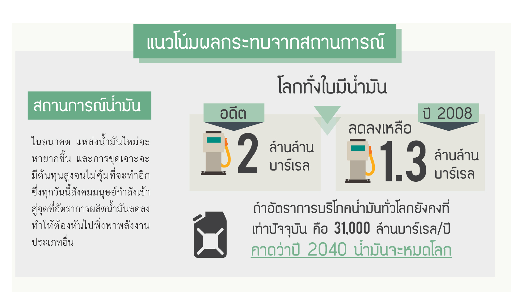ในอนาคต แหล่งน้ำมันใหม่จะหายากขึ้น และการขุดเจาะจะมีต้นทุนสูงจนไม่คุ้มที่จะทำอีก ซึ่งทุกวันนี้สังคมมนุษย์กำลังเข้าสู่จุดที่อัตราการผลิตน้ำมันลดลง ทำให้ต้องหันไปพึ่งพาพลังงานประเภทอื่น